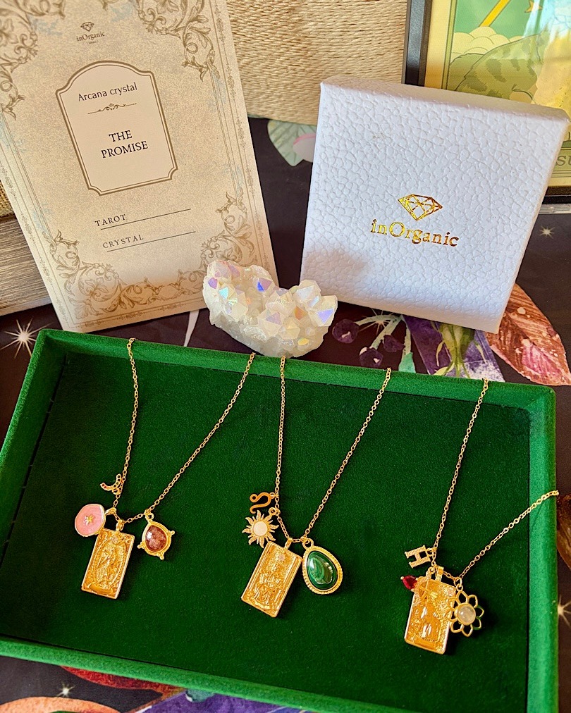 今回 inOrganic bijoux からは、タロットカードの大アルカナと天然石チャームを組み合わせてカスタムするアルカナクリスタルネックレスを販売します。